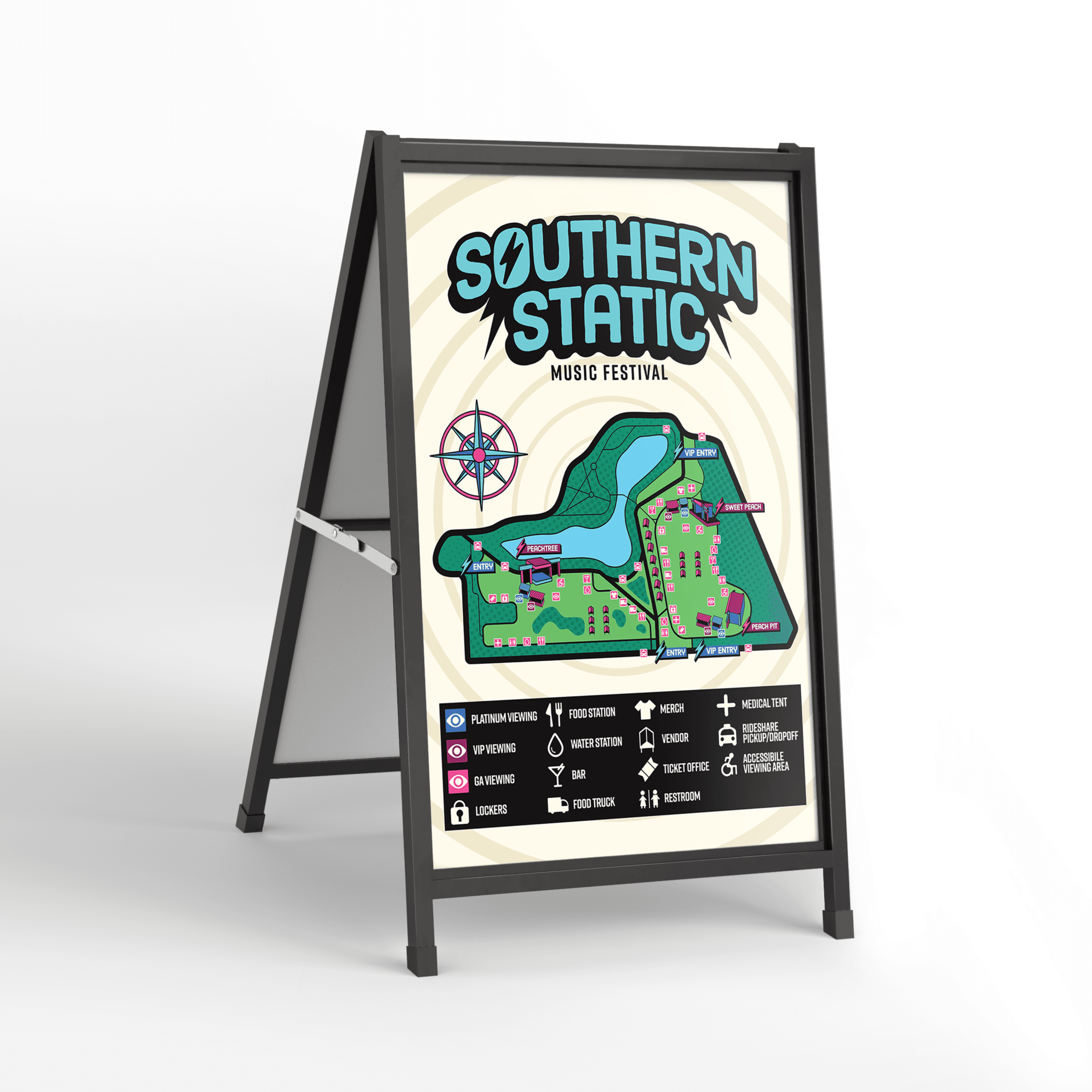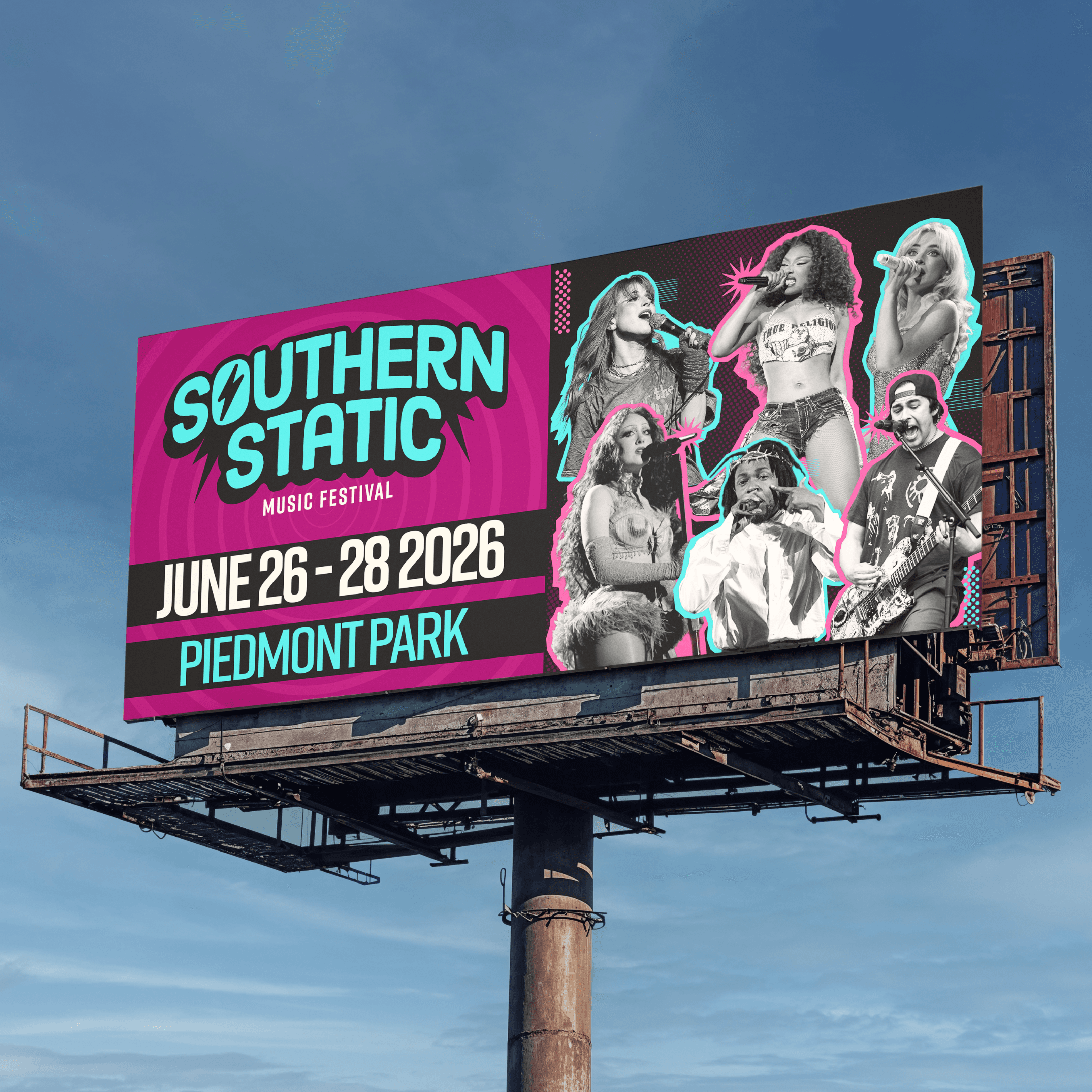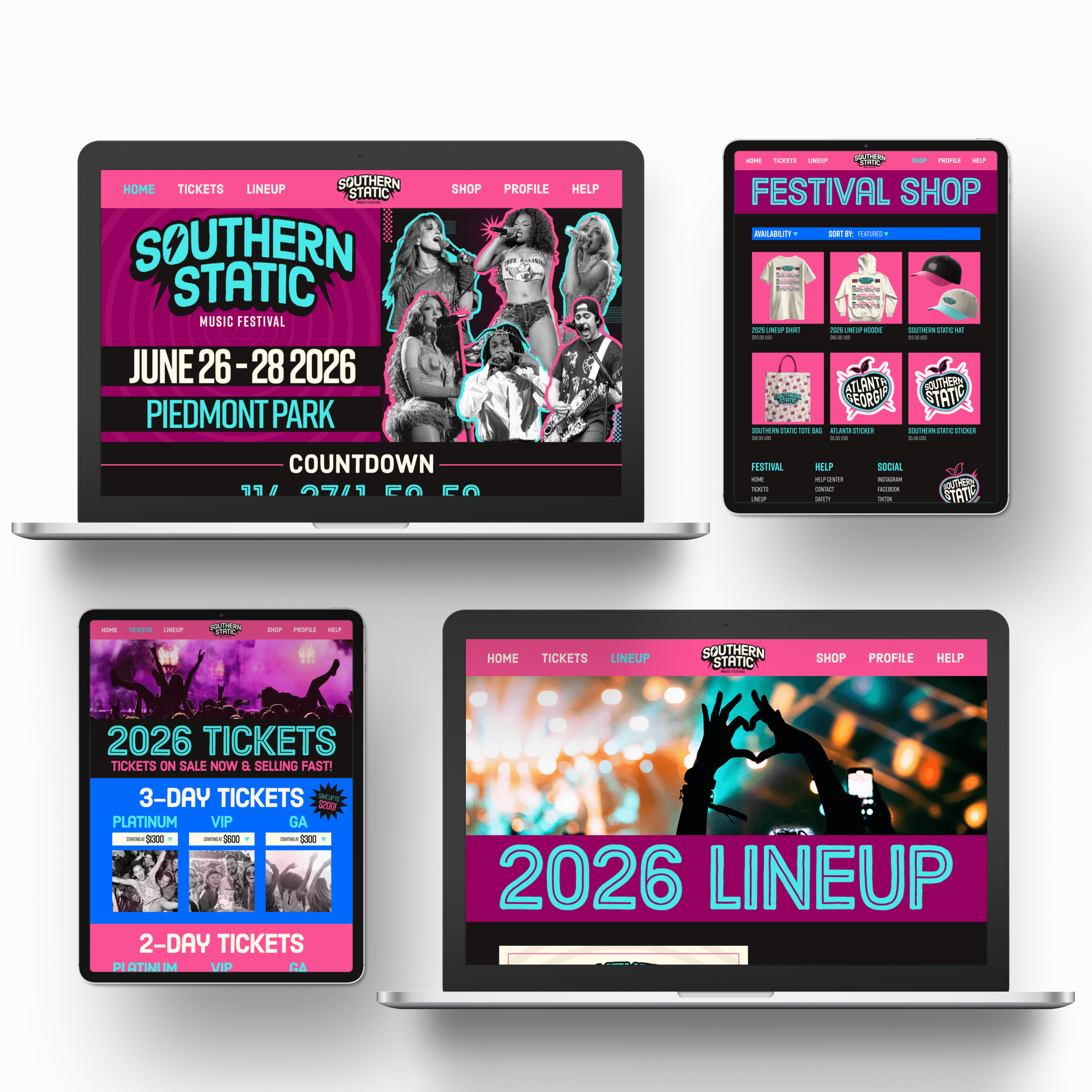 For this project, the goal was to create an original brand and/or product. I chose to create Southern Static, a three-day, outdoor music festival located at Piedmont Park in Atlanta, Georgia. Southern Static's branding is bold, energetic, and colorful, with a main focus on bright colors and graphics. For the deliverables, I created Social Media graphics (1 Carousel, 5 Individual, 2 IG Stories), Print materials (Advertisements, Festival Map, and Merchandise), Packaging designs (Wristband, lanyards and badges), UI/UX (Website and App prototype), and a 3D model and print of one of the festival stages.